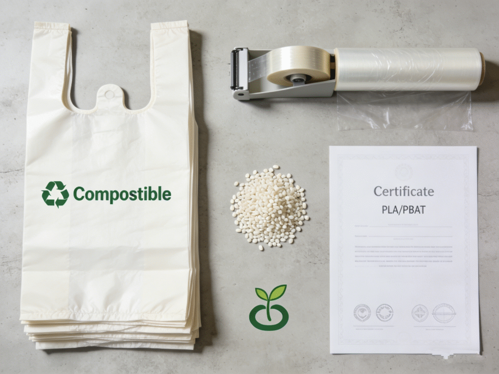 We formulate every product from plant-based PLA, PBAT, and corn starch – no microplastics, no toxic residues. Our materials hold TUV, OK Compost HOME, BPI, EN13432, and ASTM D6400 certifications, ensuring complete degradation in home or industrial composting within 90–180 days.